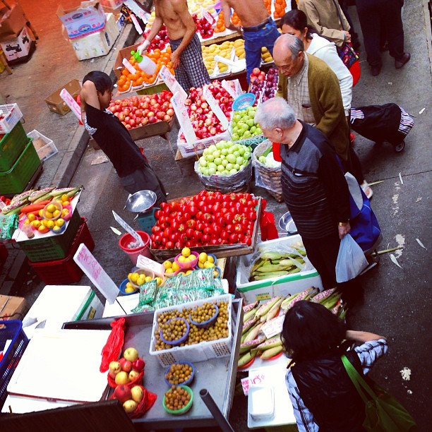 handbags or vegetables? tough shopping choices on the street market of Hong Kong