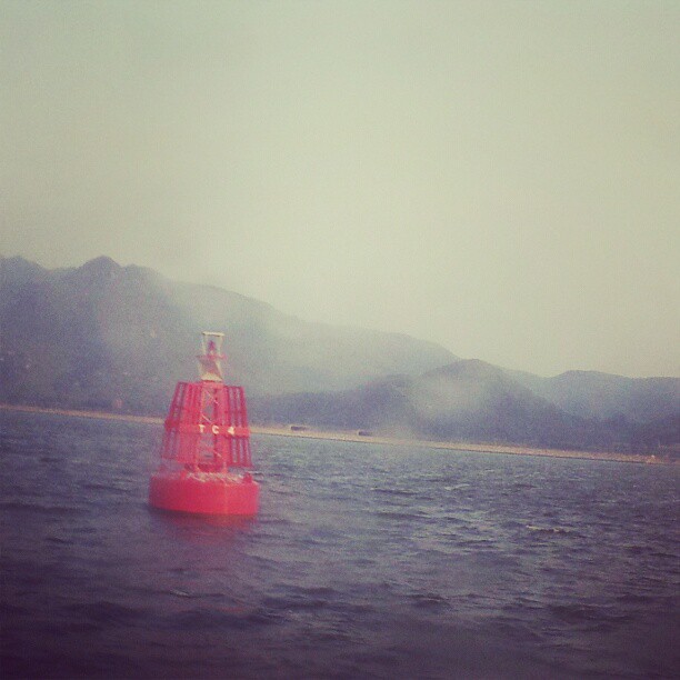 A buoy through a salt-stained window