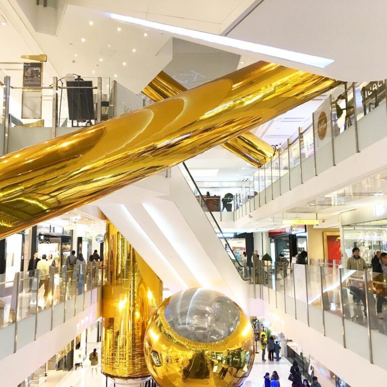 installationart at K11 in Tsim Sha Tsui titled GoldenBubbles, part of the UrbanSense exhibition. Golden tubes connect
