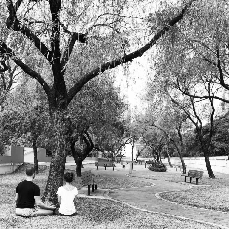 The calm in the city. A couple in meditation around a tree in Tsim Sha Tsui park. This is a quiet corner in the busy