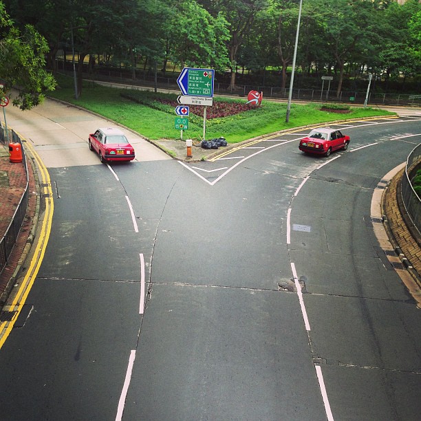 mirror image – an illusion of a reflection of roads and taxis. It’s actually a fork in the road with a taxi on each
