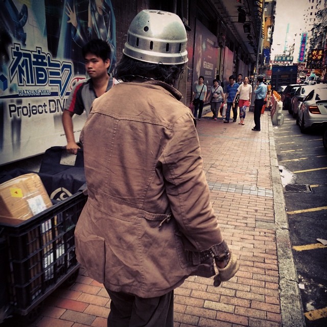 tinfoil hat? No, it’s a fullmetal hobo. This guy in ShamShuiPo is not only has a metal hat but is also wearing (you