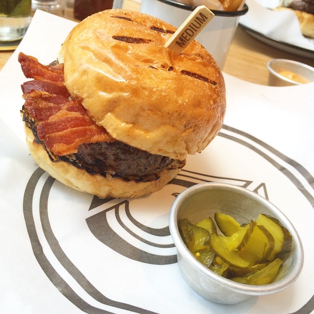 A bacon cheeseburger at BeefNLiberty, pickles on the side