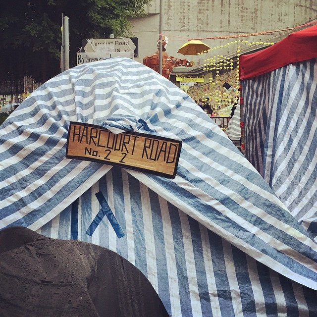 A live OccupyHK art installation on HarcourtRoad at Admiralty. Protesters with yellow umbrellas form the shape of a big