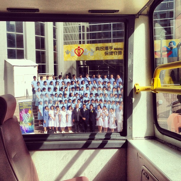A group photo framed through a bus window