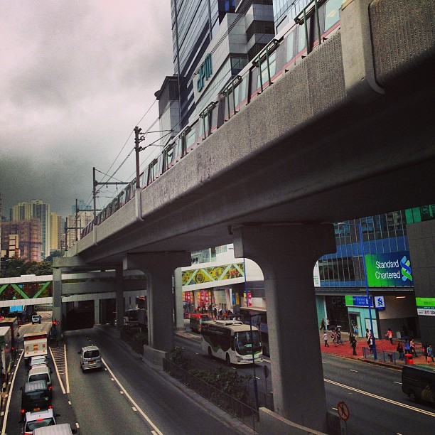 The #mtr #train zooms off into the distance on a #grey #cloudy #morning. A splash of colours is added by #StandardChartered, can you spot it? #hk #hongkong #hkig