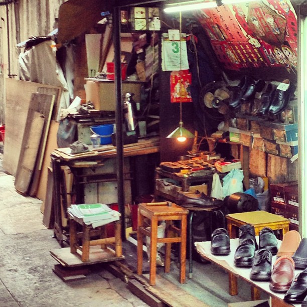 The street cobbler stall. Old school mens shoes for sale too. Hong Kong HK HKIG