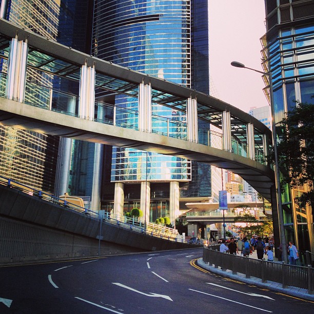 #steel #pedestrian #walkway/ #bridge over a #road between to #buildings of #glass and #steel in #central #hongkong. #hk #hkig