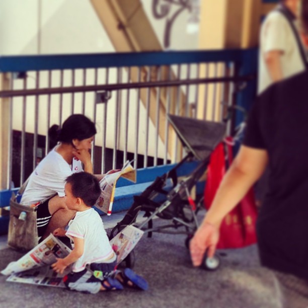 A #woman reads the #newspaper on a busy #pedestrian #overpass while her #child plays with the newspapers on the floor. #hongkong #hk #hkig