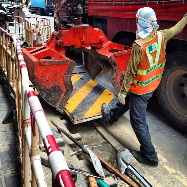 #roadworks - a #worker places a #steel plate over a trench dug in the #road. #hongkong #hk #hkig