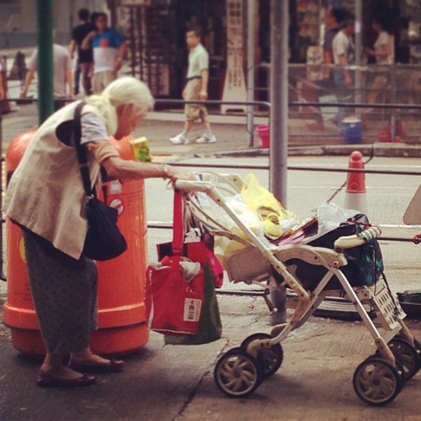 An #old #lady digs through a #trash #bin for recyclables. #hongkong #hk #hkig