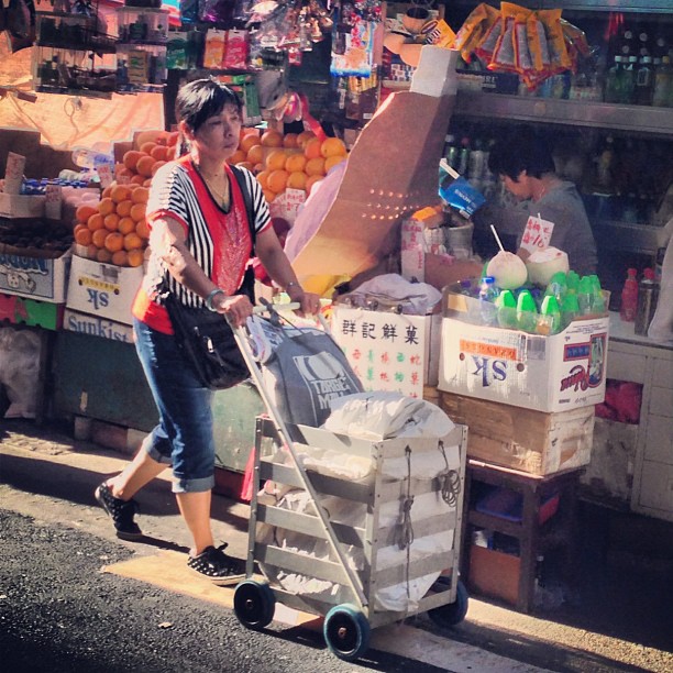 A #lady wheels her #trolly with a #fruit #stall in the background. #hongkong #hk #hkig
