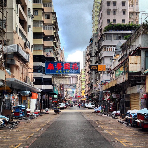 This is ladiesmarket (TungChoi street) in the morning. Pretty deserted
