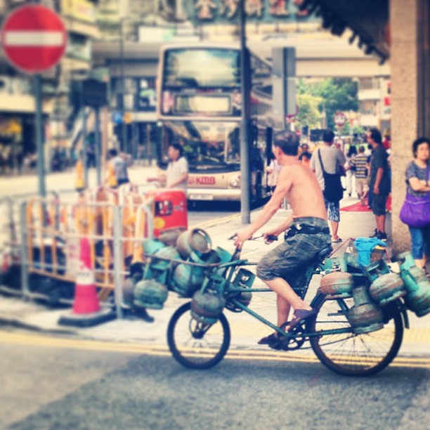 An #old #man on a #bicycle carries a cargo of used #gas tanks to be recycled. #hongkong #hk #hkig