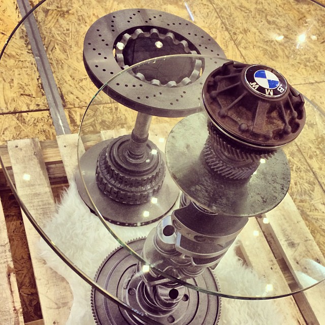 At the #K11 Design Mart 2013 - #Sustainable #Design. A #glass #table and #stool made from leftover #autoparts. Upcycled by #hongkong company ATB Auto Art. Visit www.atbautoart.com for more.