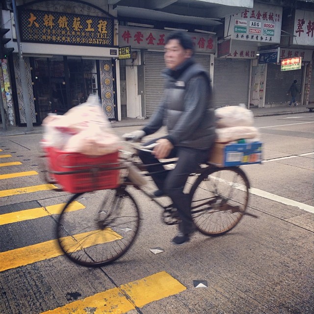 Zoom! – a delivery man rides his bicycle full of groceries along a road in Mong Kok. Also opposite effect: still