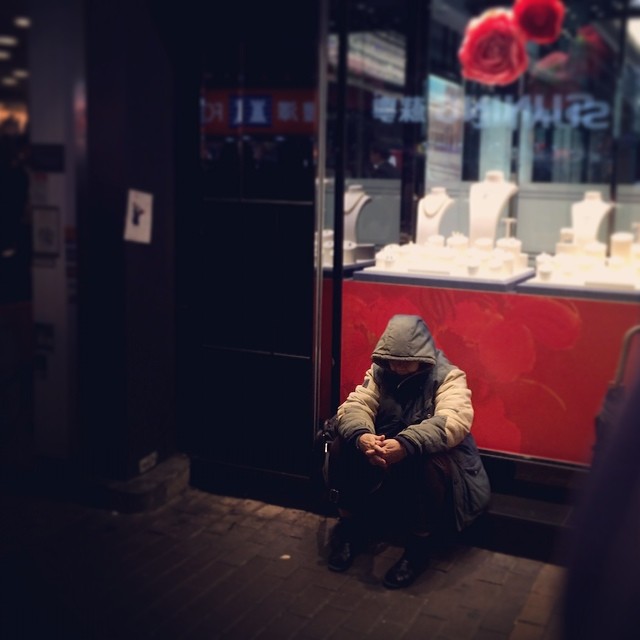 #contrast - #luxury and #poverty. An old man sits outside the brightly lit window of a #jewelry store. #hongkong #hk #hkig