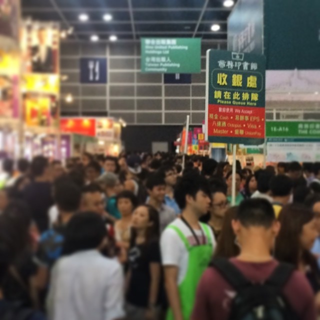 The Hong Kong bookfair is such a sea of people that stalls deploy staff with tall signs to denote the start of the queue