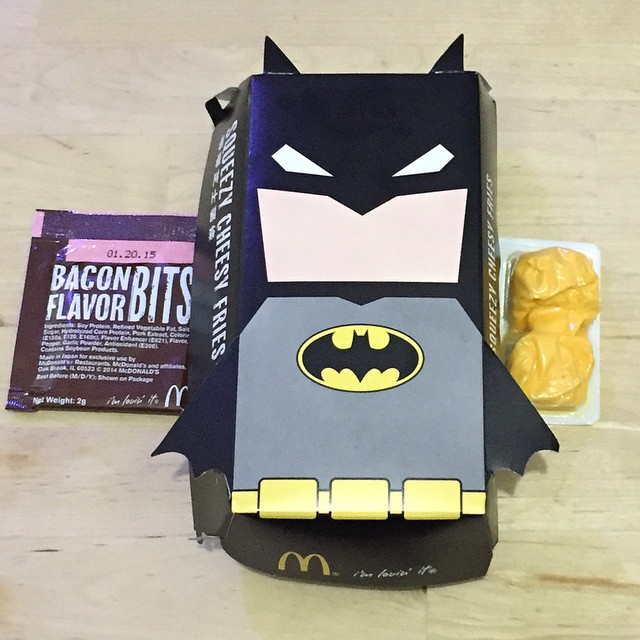 The #McDonalds #HongKong #Batman #burger meal comes with "Squeezy Cheesy #Fries"... which is just their regular #frenchfries in a Batman box (note the popup ears and cape) and a packet of bacon bits and a packet of cheese whip. #hk #hkig
