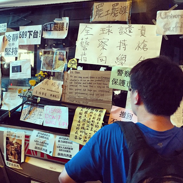 A passerby stops to read #OccupyHK messages posted by #protesters on a trapped bus on #NathanRoad in #Mongkok. #HongKong #hk #hkig