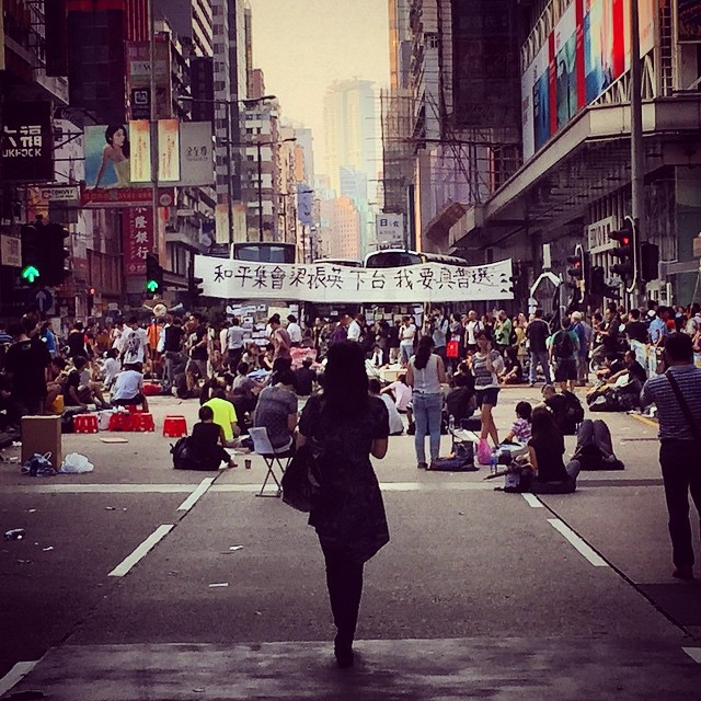 Dawn breaks on day 3 of OccupyHK in Mong Kok. A silhouette of a lone woman watches the crowd at the junction