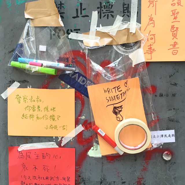 At OccupyHK in Causeway Bay, an electric box has been turned into an impromptu messageboard. Sticky tape, papers