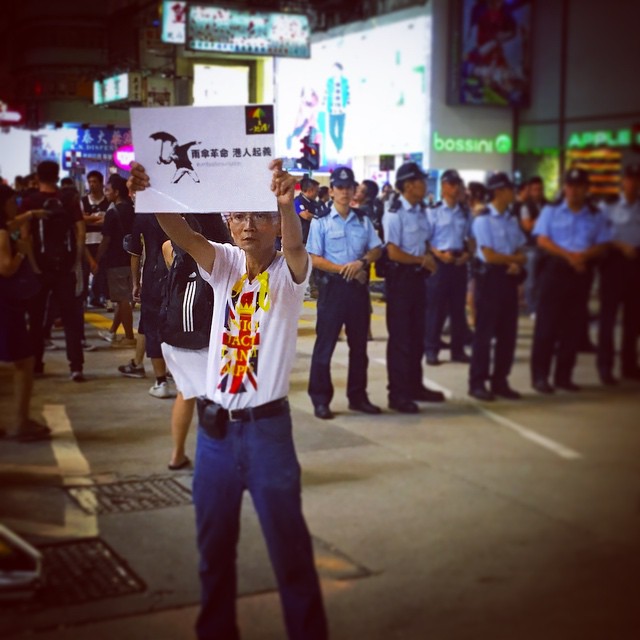 A lone man holds up a sign for the #umbrellarevolution while the #police hold the line behind him. #OccupyHK #Mongkok #HongKong #hk #hkig