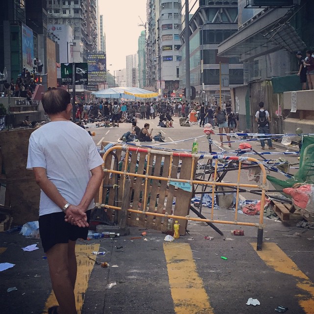 Dawn breaks on embattled day 8 of #OccupyHK in #Mongkok. An old man walks past an crumbling #barricade. #HongKong #hk #hkig