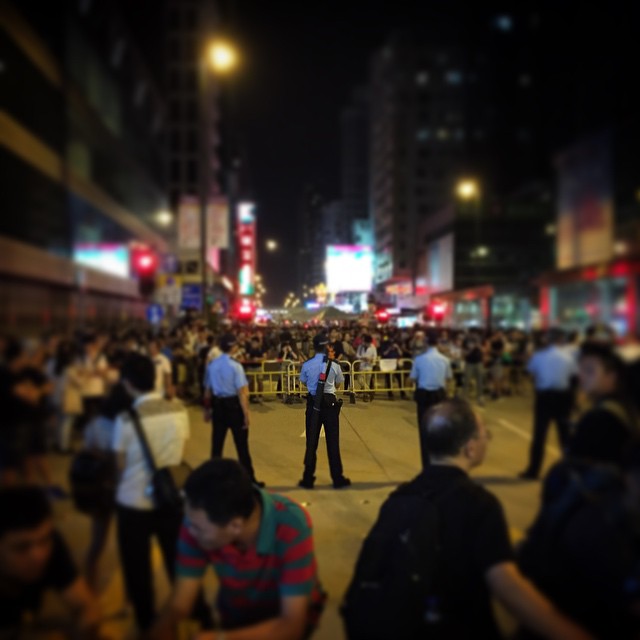 Can you spot him? In the centre. That #police is the standard-bearer. He carries the #redflag that signifies the use of force. They're in a line, they weren't before. I hope things aren't about to go down at #OccupyHK in #Mongkok. #hk #hkig