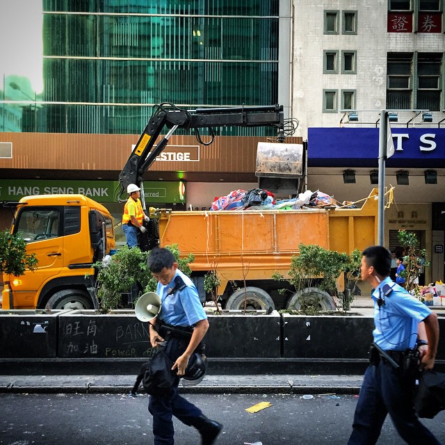 A truck with attached crane arm clears tents and debris on NathanRoad while police officers stream past. OccupyHK Mong