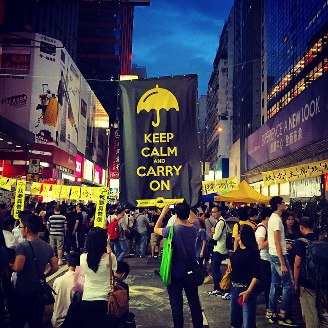A giant #KeepCalmAndCarryOn #banner on #NathanRoad in #Mongkok draws a lot of attention from the crowd. #OccupyHK #HongKong #hk #hkig