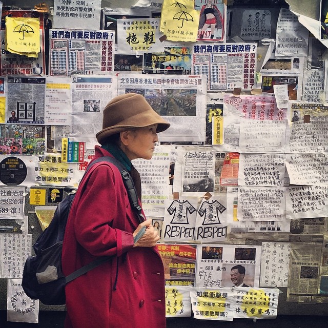 An old #lady walks past a wall filled with #OccupyHK #flyers and #posters in #Mongkok. #HongKong #hk #hkig