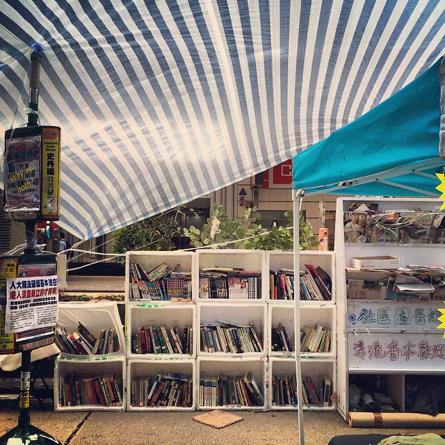 books under a tarp – the OccupyHK mini-library on NathanRoad in Mong Kok has expanded somewhat. There’s cover (a tarp