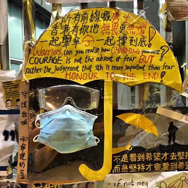 More umbrellarevolution protest art. YOU are the heroes. A mirror with mounted goggles and facemask