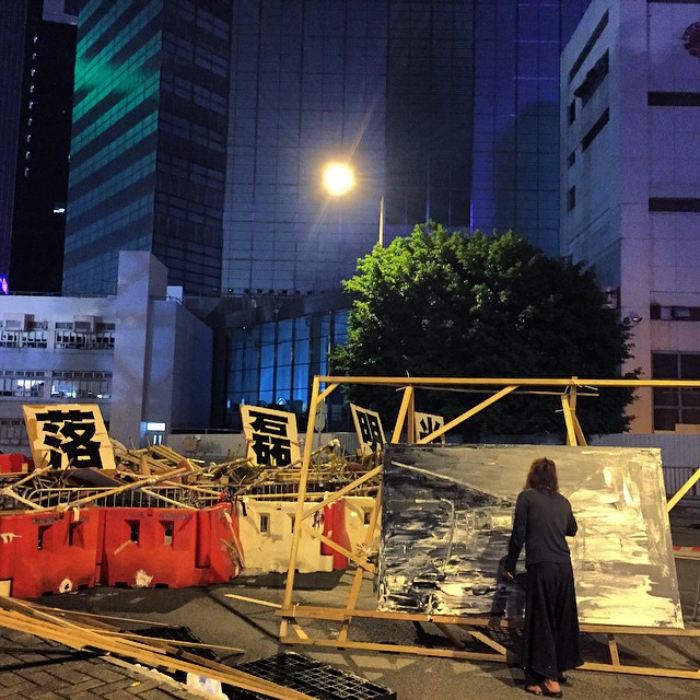 An artist / painter at work on a huge painting (looks like oil on canvas) at a barricade at OccupyHK Admiralty