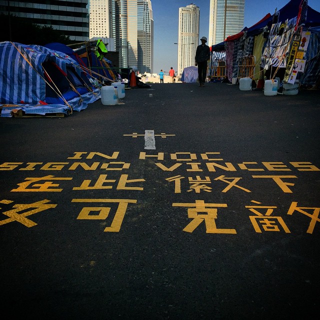 Didn’t expect to see Latin on the streets of OccupyHK Admiralty but there it is on HarcourtRoad – “in hoc signo vinces”