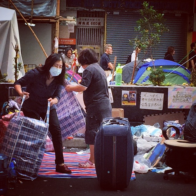 Today is the clearout day for OccupyHK Mong Kok. protesters are packing their bags, folding their tents and getting