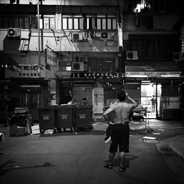 After a hard days work. A #man stands shirtless amongst the closed stalls of a #streetmarket in #Mongkok. #HongKong #hk #hkig