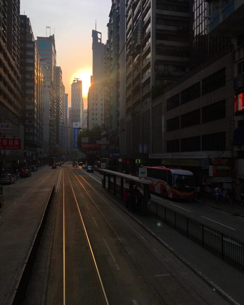 #evening on the border of #CausewayBay / #WanChai. The view of the #sun setting in an #urbanvalley as seen from the #tram. #hongkong #hk #hkig #sunset