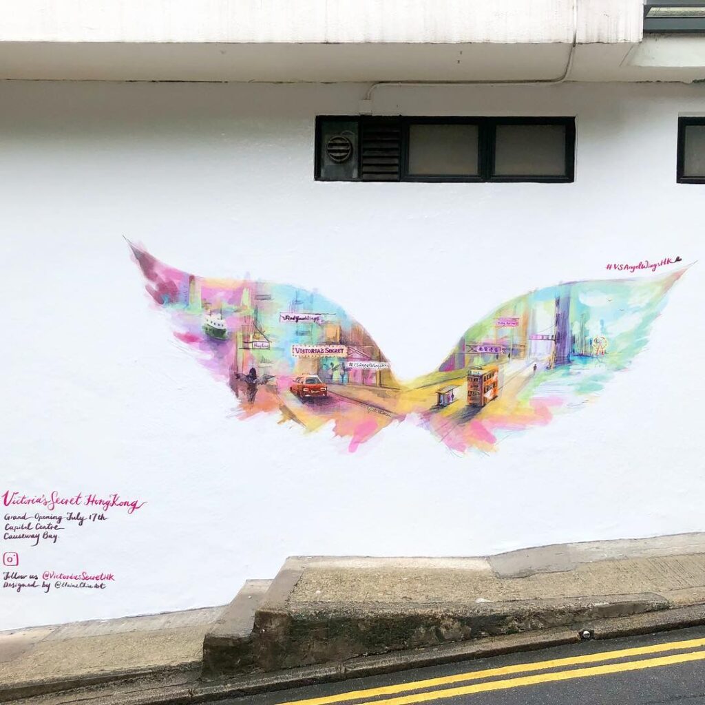 Good branding strategy. @VictoriasSecretHK has commissioned an #angelwings type #streetart by @elainechiuart for their #HongKong store launch. It's on #AberdeenStreet next to #PMQ. It's obviously designed for people to pose in front of it. I wonder how well the campaign is doing. #HK #hkig #VSAngelWingsHK
