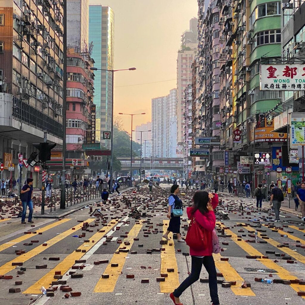 A lady walks through Mong Kok. The roads are littered with bricks due to the Hong Kong protest. Traffic in HK today is