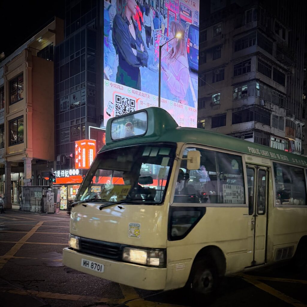 A green minibus on the streets of Mong Kok, Kowloon