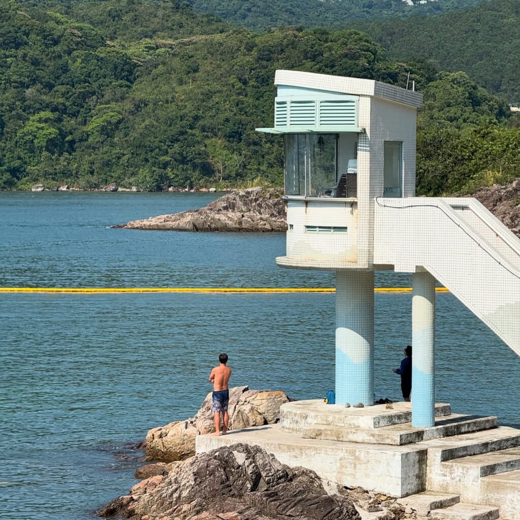 A man and a lifeguard tower at Trio Beach, in Hebe Haven, Sai Kung.