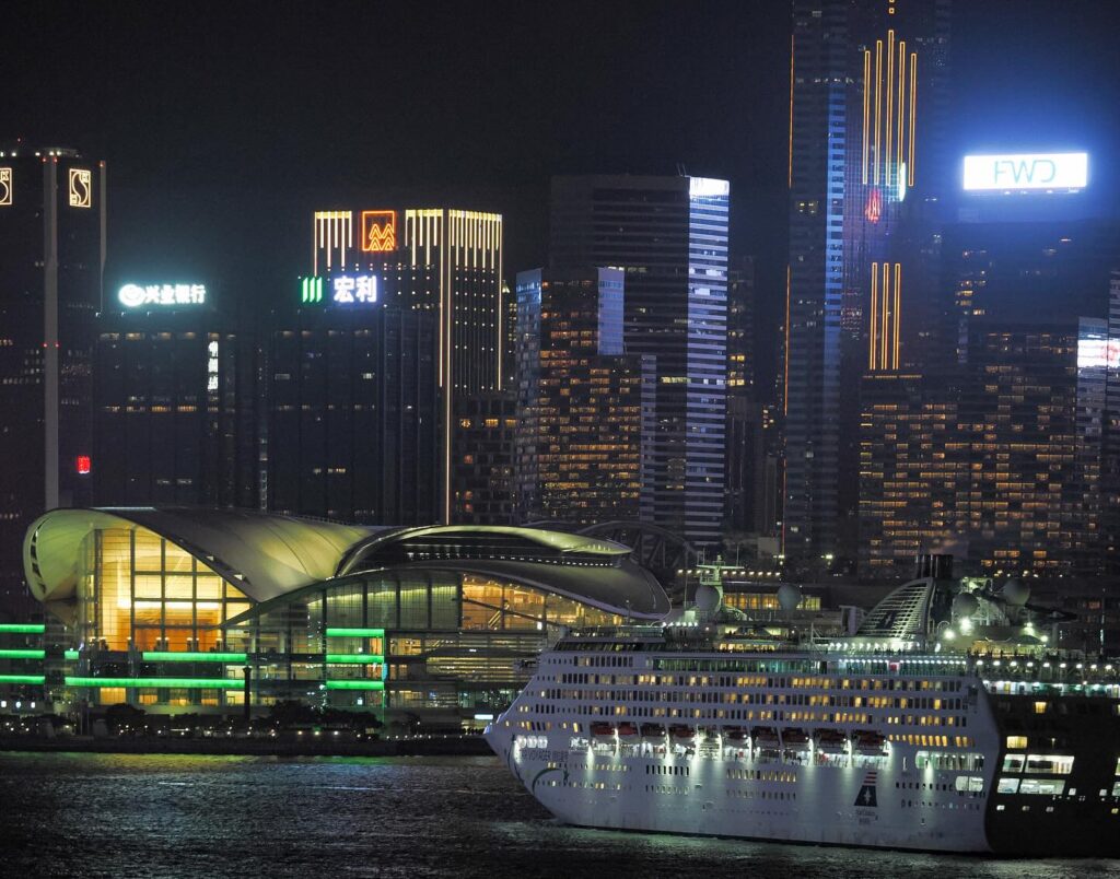A Star Cruises cruise ship sails on Victoria Harbour, past the Wan Chai Convention Centre.