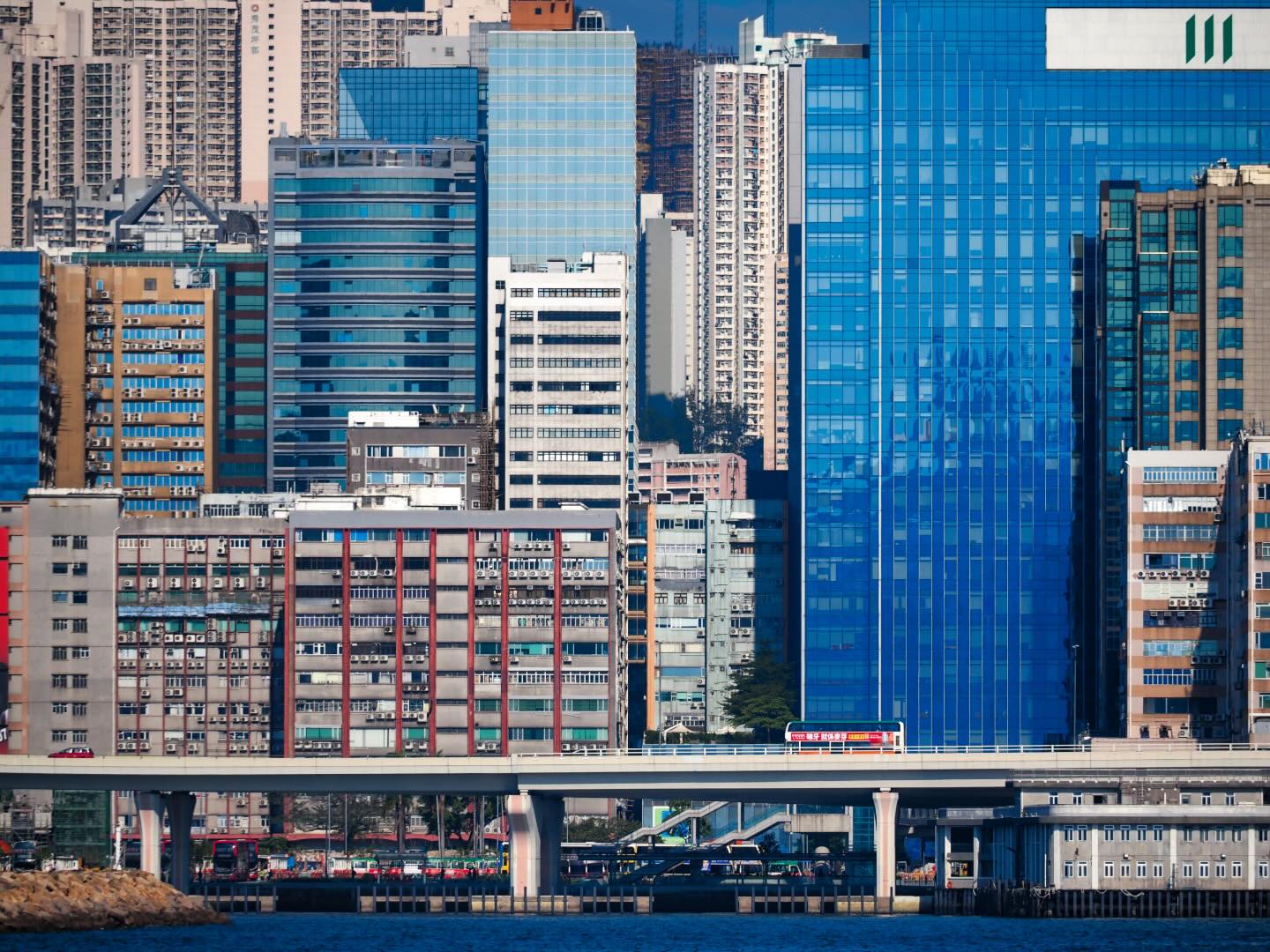 The huge urban density of Kwun Tong. The Kwun Tong bypass skirts around the edges of Victoria Harbour, taking traffic past the tiny streets of Kwun Tong.