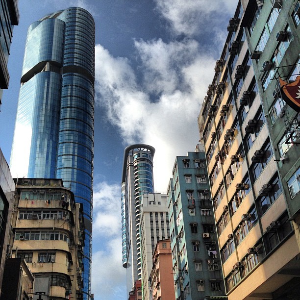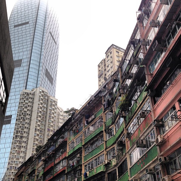 Towers of glass and steel loom over the old buildings of Mong Kok