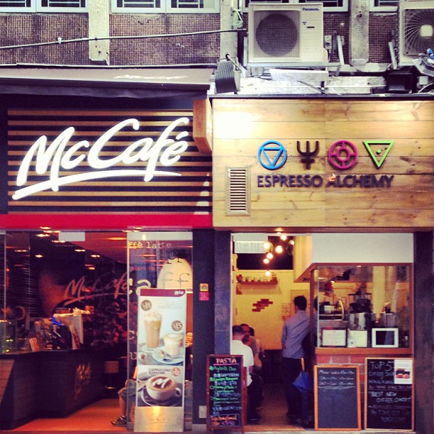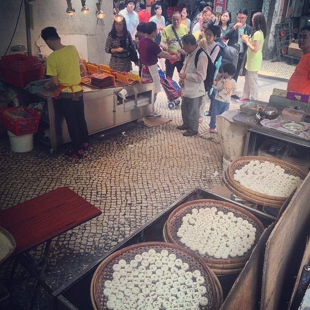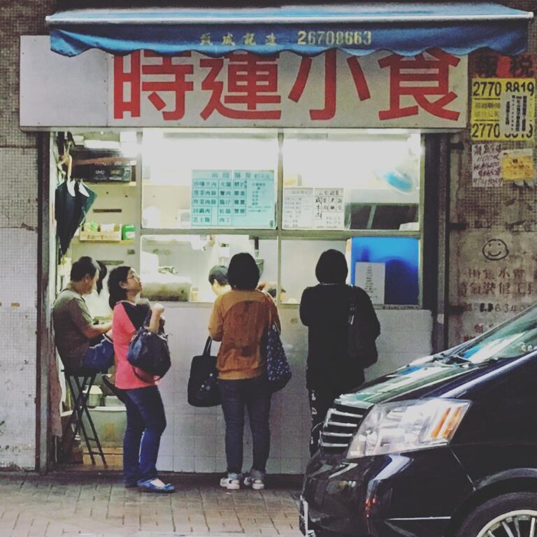 People grabbing breakfast at a traditional hole-in-the-wall takeaway food counter in Hong Kong on a rainy morning