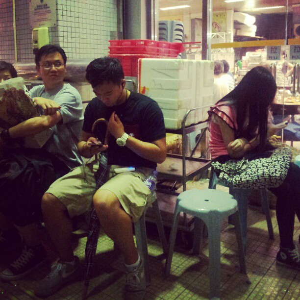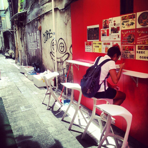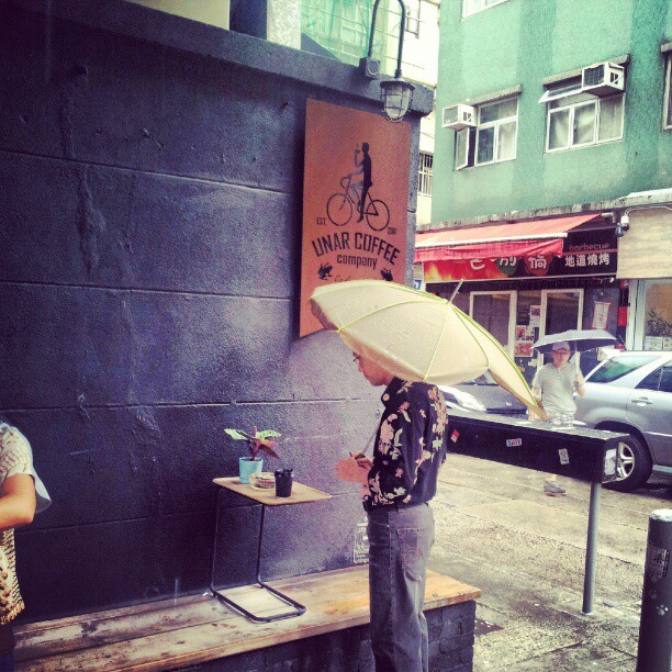 Watching the world go by with a cuppa coffee under an awning, in a back lane in Hong Kong in the rain. Can I get my
