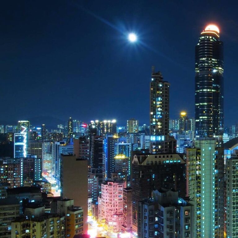 Mong Kok on a summer night. langhamplace watches over rivers of light