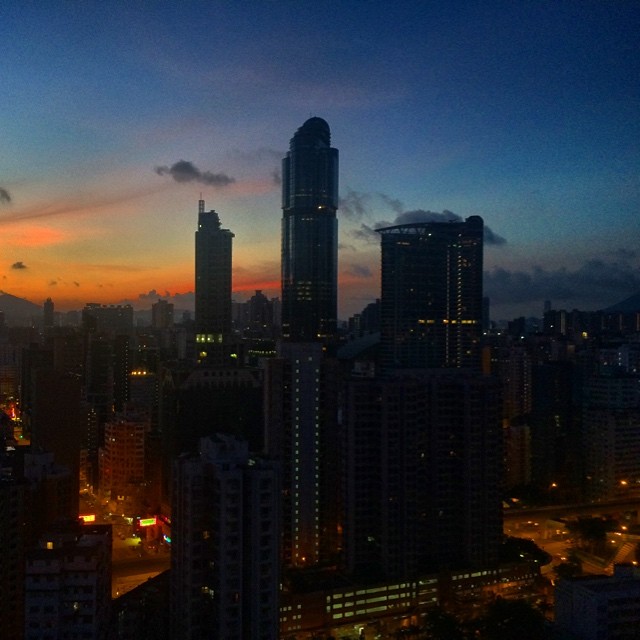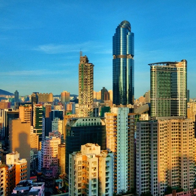 Tsim Sha Tsui in the evening, TheOne towers into the blue sky